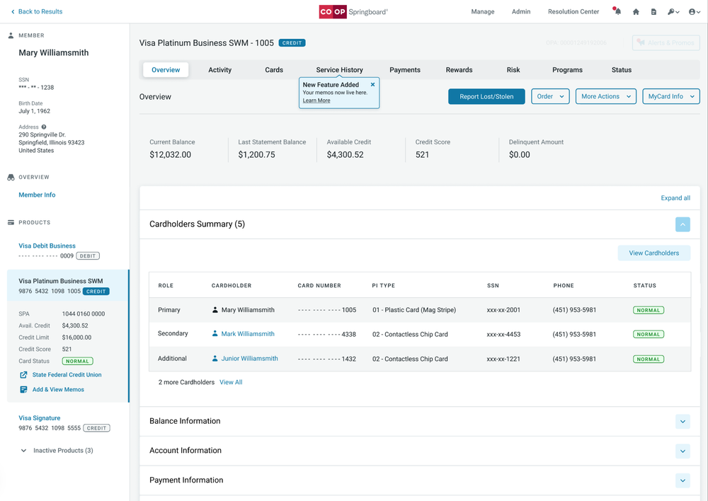 I worked with our developers to implement the design, and they delivered React UI components for Co-op’s engineers to use. Co-op Springboard launched as a web application that gives credit unions real-time access to cardholder account information as part of one system. It is now live helping over 1,000 global Credit Unions deliver improved member services and increase productivity due to the simplified account management experience.