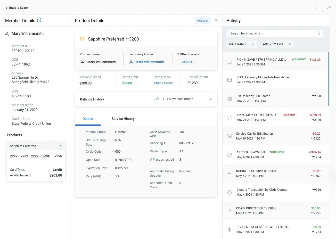 Our design solution minimized the time it takes for Credit Union representatives to navigate between member products and find transaction data by 13%.