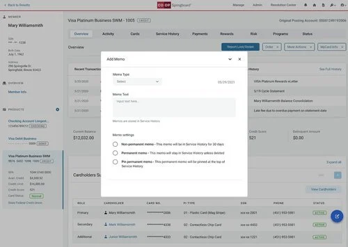 Sometimes a service representative helps members with 2-4 service requests at a time and they need to quickly reference the cardholder’s information on their account and document each service they helped the member with